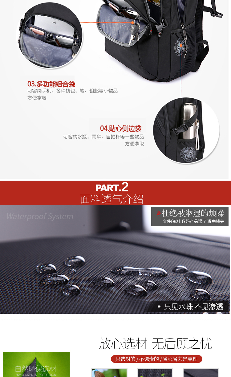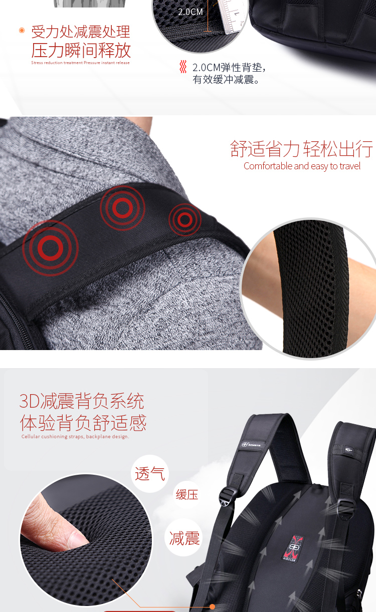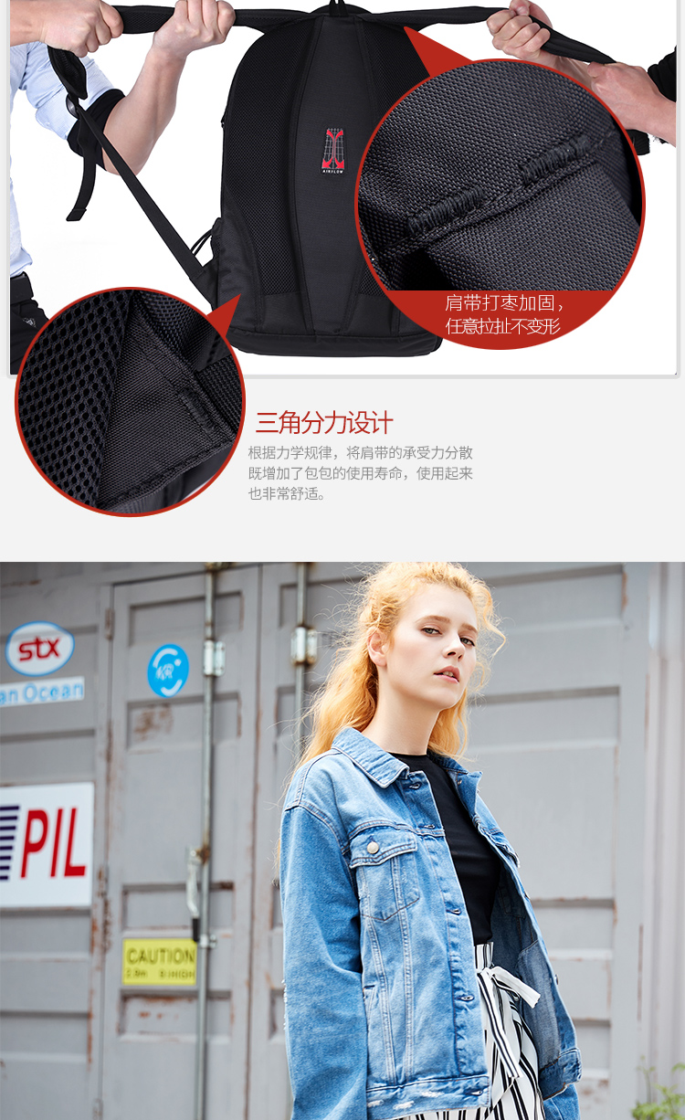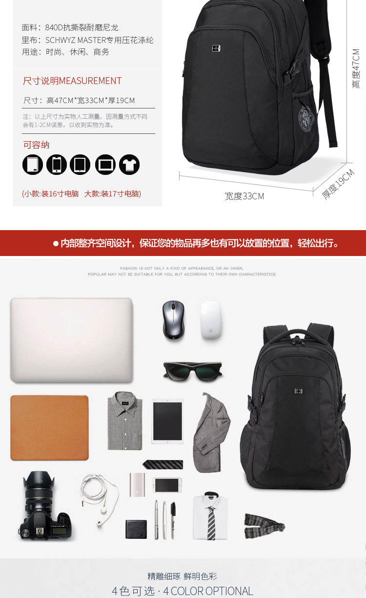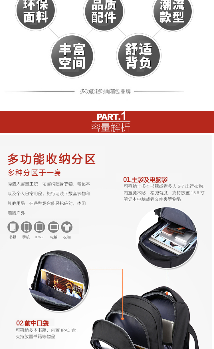 • 内部结构:网袋 拉链暗袋 手机袋 证件袋 夹层拉链袋 电脑插袋