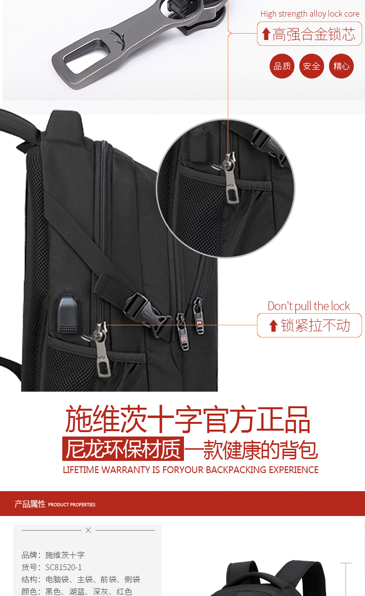 • 商品名称:施维茨十字男士双肩包休闲商务电脑包旅行背包韩版高中学生书包女