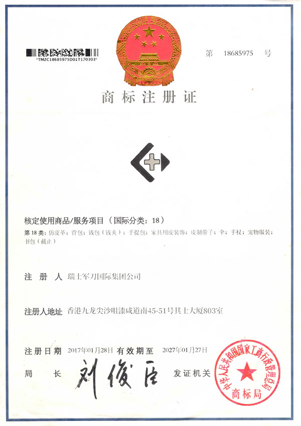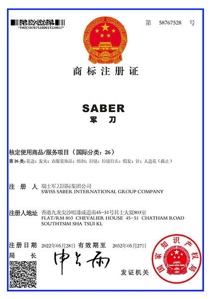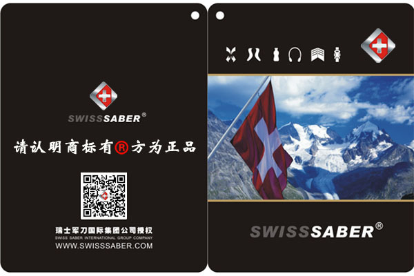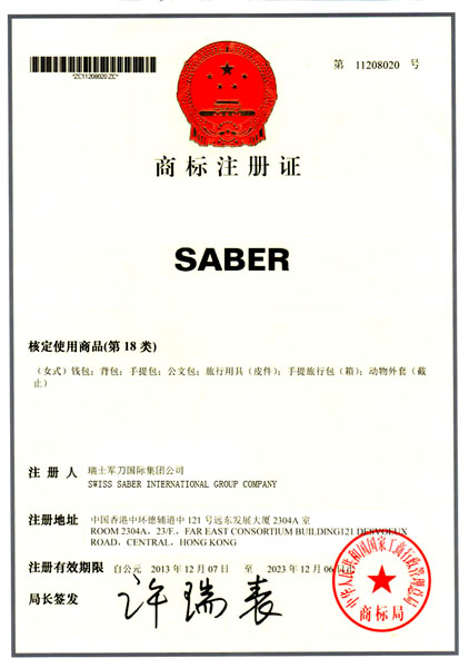 SABER中文翻译为军刀(请见百度翻译)军刀翻译为英文是SABER,根据商标法规定的审查原则,任何和SABER及中文翻译为军刀的商标,在音、形、意三方面近似没有显著区别的商标都会构成侵权。因此,他人使用“瑞士军刀”作为商品名称或商标使用将涉嫌构成商标侵权。“瑞士”作为国家名称是不可能获得商标注册不能获得专用权,以国别为前缀的商标使用都构成对”SABER“商标的侵权,不论”瑞士“”法国“”意大利“等都构成侵权。在中国真正的可以叫军刀的注册商标只有SABER,市场上销售的XX军刀、军刀XX箱包都是傍名牌行为,请认明购买。