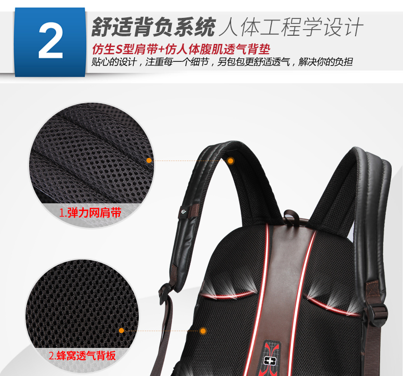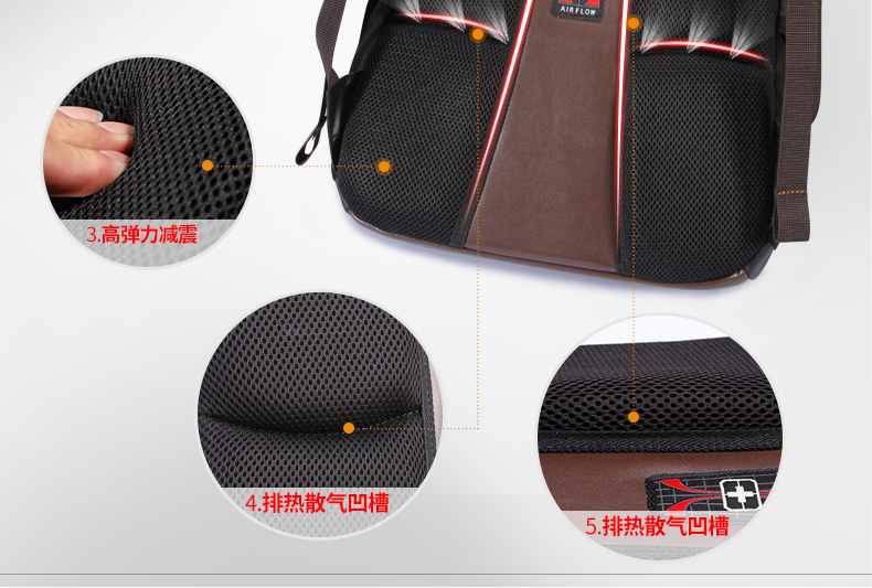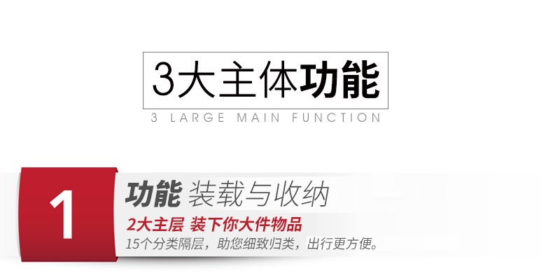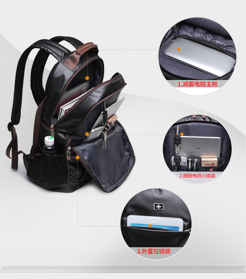 • 内部结构:网袋 拉链暗袋 手机袋 证件袋 夹层拉链袋 电脑插袋 相机插袋