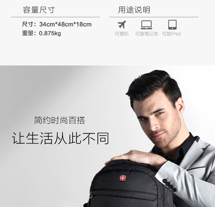 • 商品名称:瑞士军刀双肩包休闲运动背包黑色户外包15寸笔记本电脑包 SA-9037