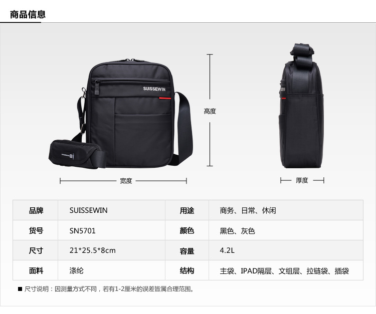 品牌:SUISSEWIN商品名称:SUISSEWIN 单肩包 户外休闲系列单肩斜跨包SN5701